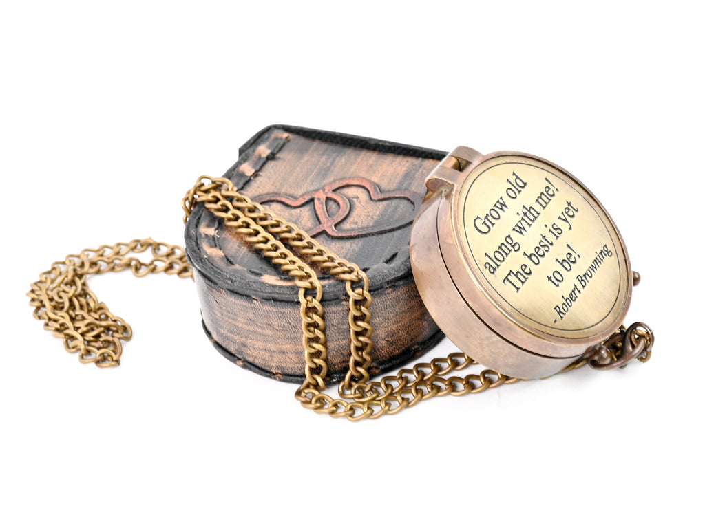 Hanzla Collection - Grow Old with Me Engraved Brass Compass ON Chain with Leather CASE, Directional Magnetic Compass - 11505